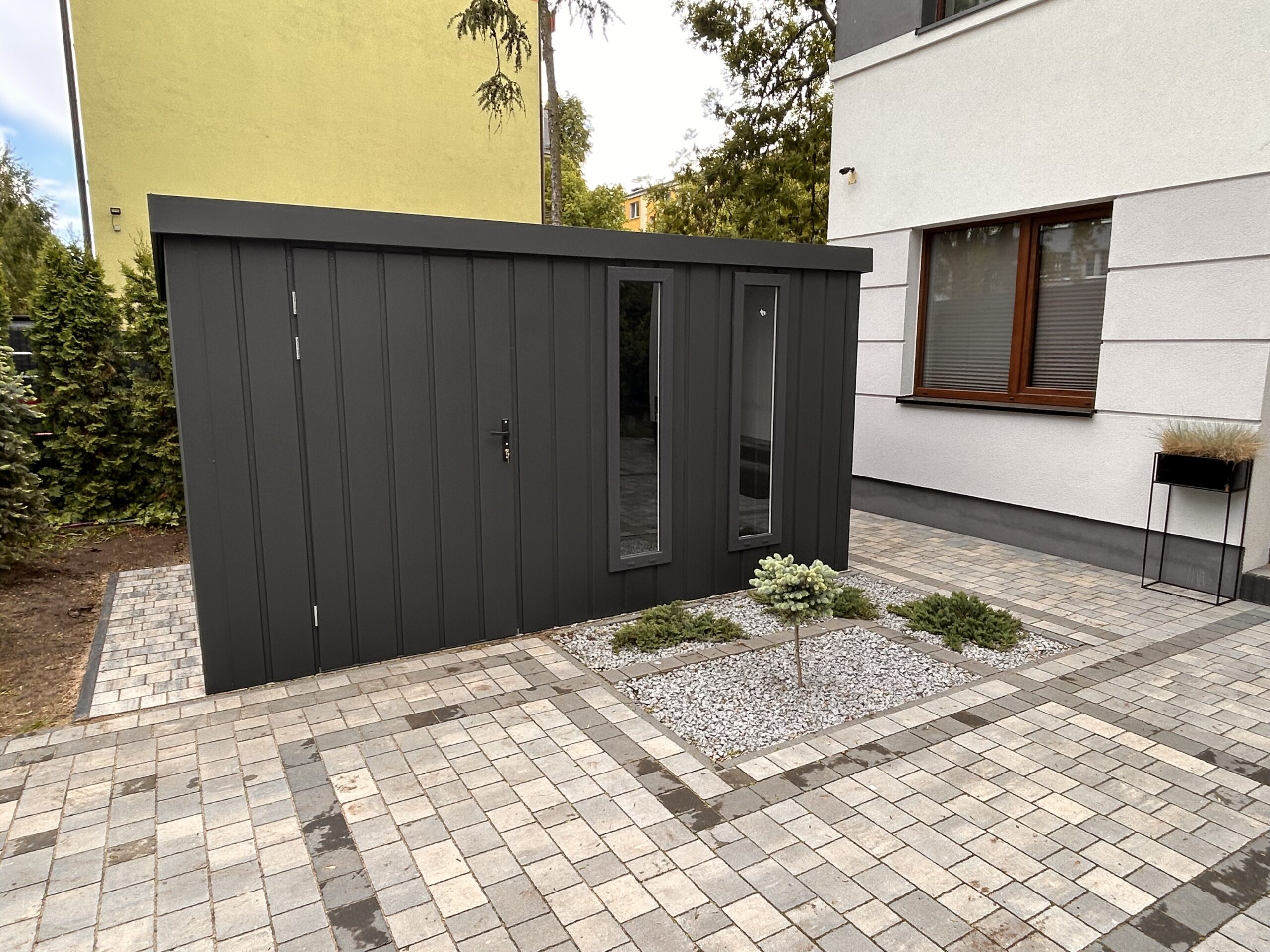 Dach jednospadowy do tyłu, blacha trapezowa z filcem antyskropleniowym, kolor grafit mat 7016