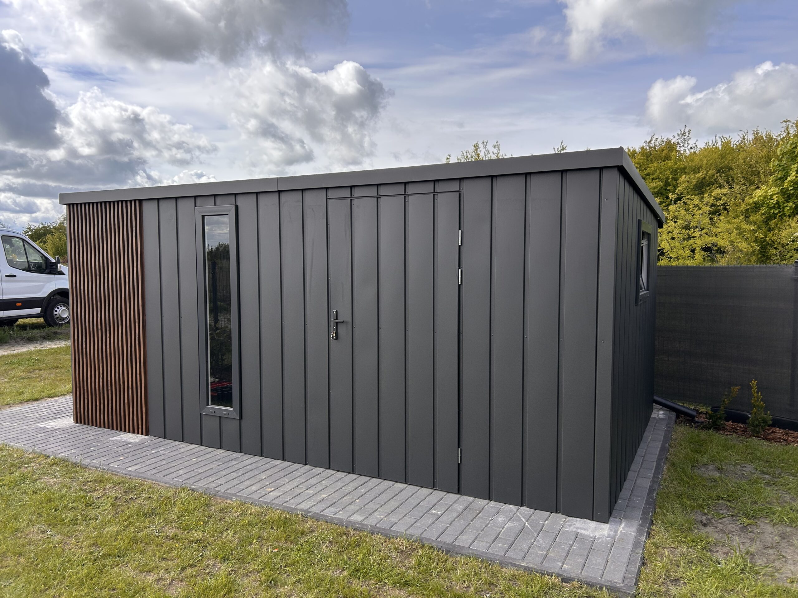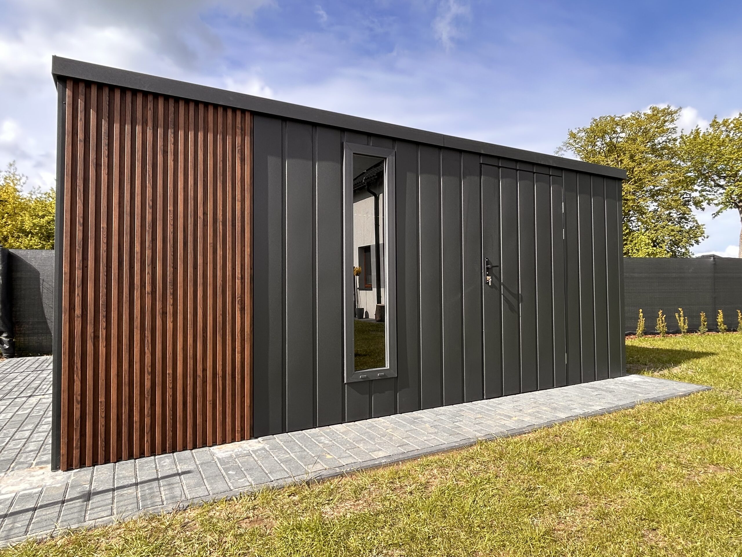 Dach jednospadowy do tyłu, blacha trapezowa z filcem antyskropleniowym, kolor grafit mat 7016