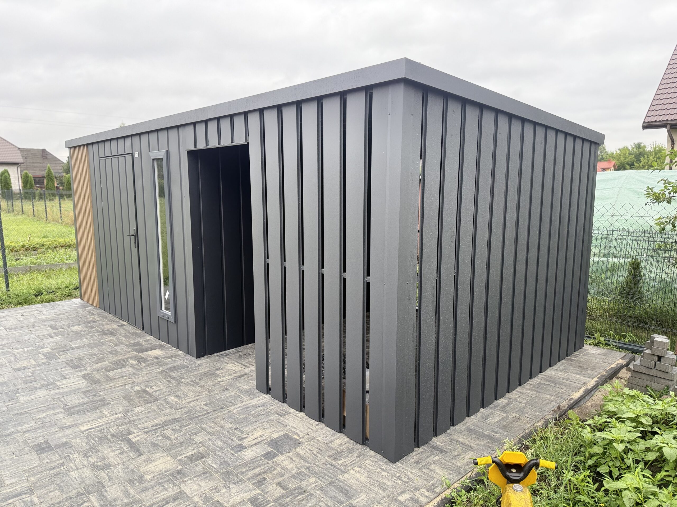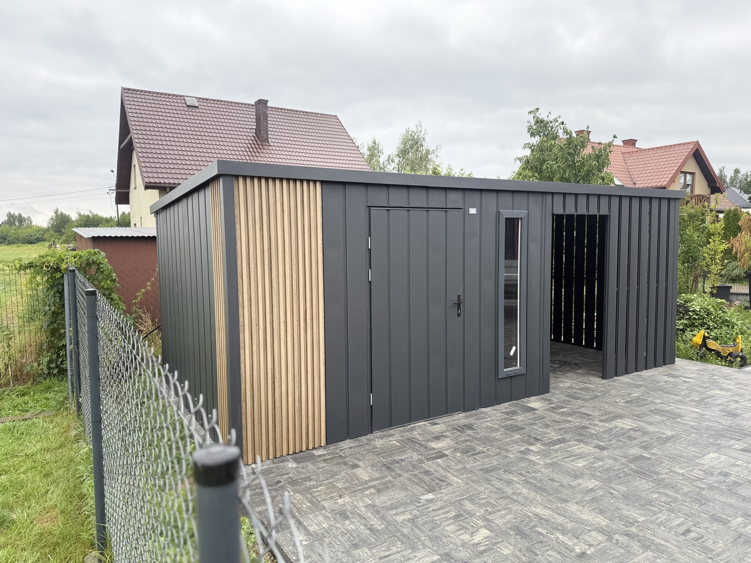 Dach jednospadowy do tyłu, blacha trapezowa z filcem antyskropleniowym, kolor grafit mat 7016