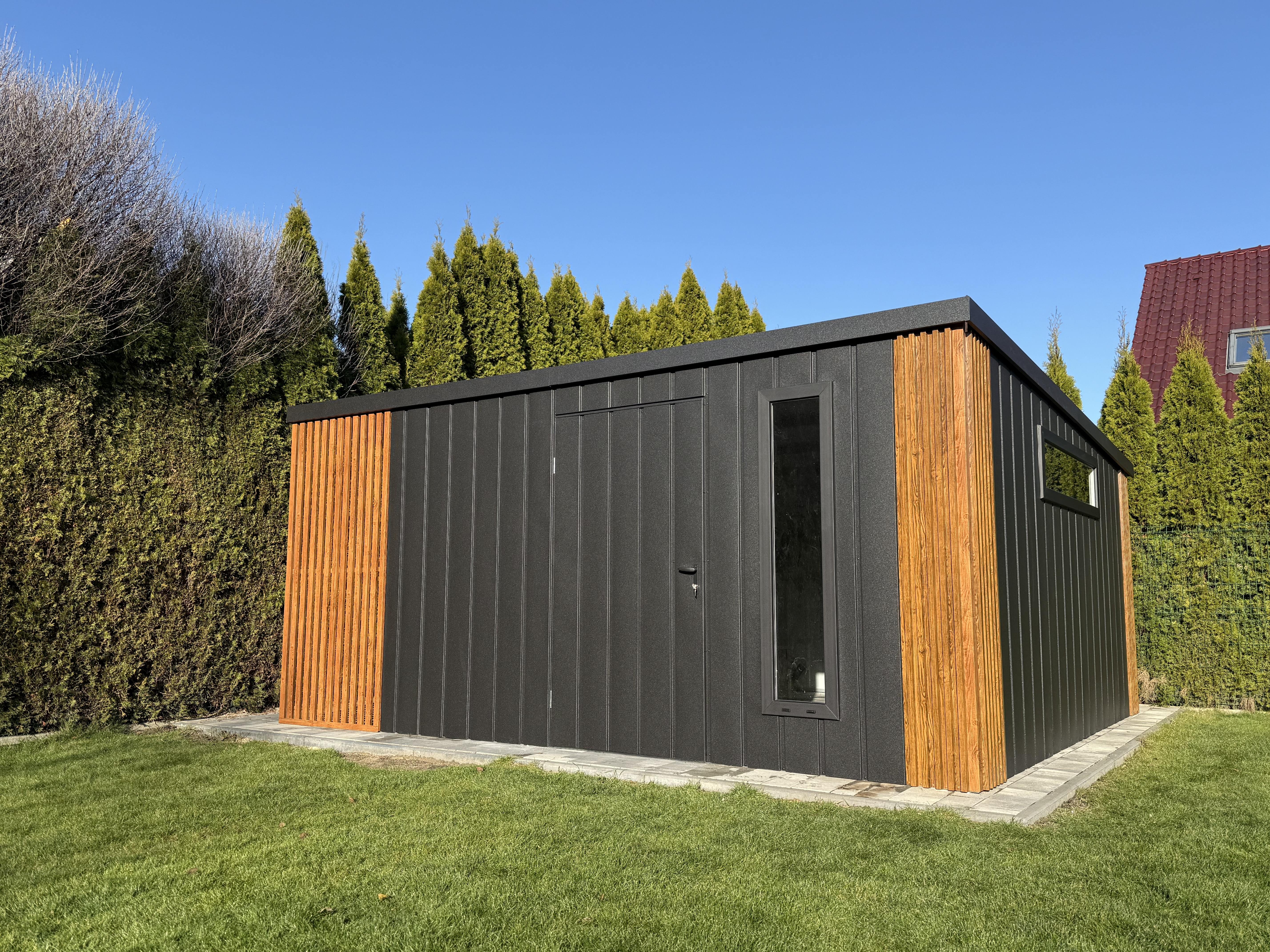 Dach jednospadowy do tylu, blacha trapezowa z filcem antyskropleniowym, kolor czarny mat 9005