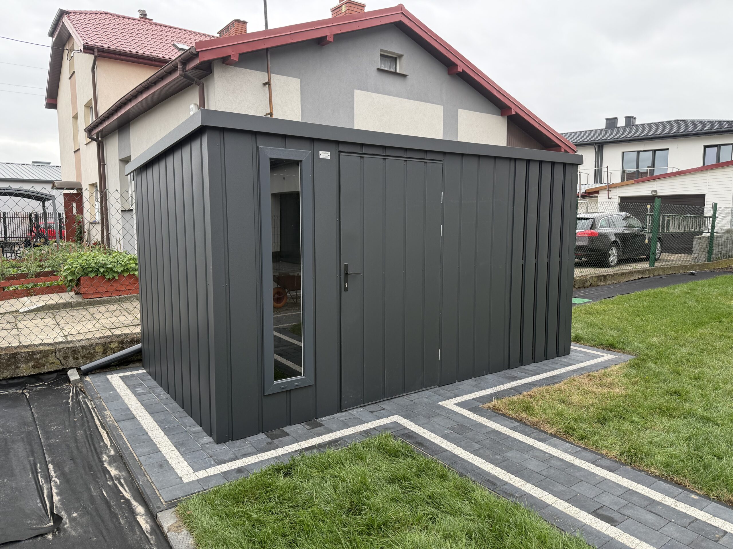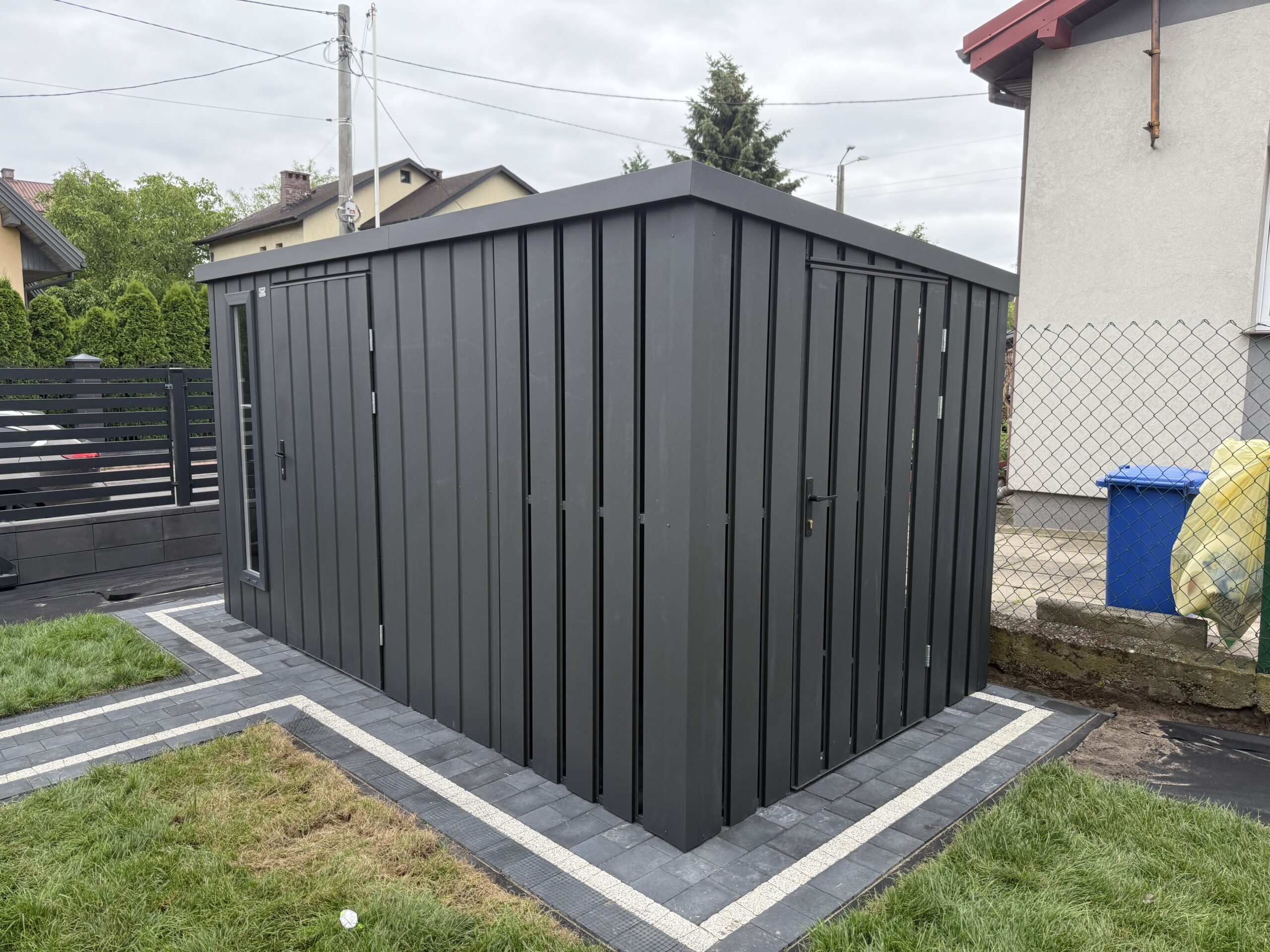 Domek narzędziowy 300×220 + wiata śmietnikowa 100×220