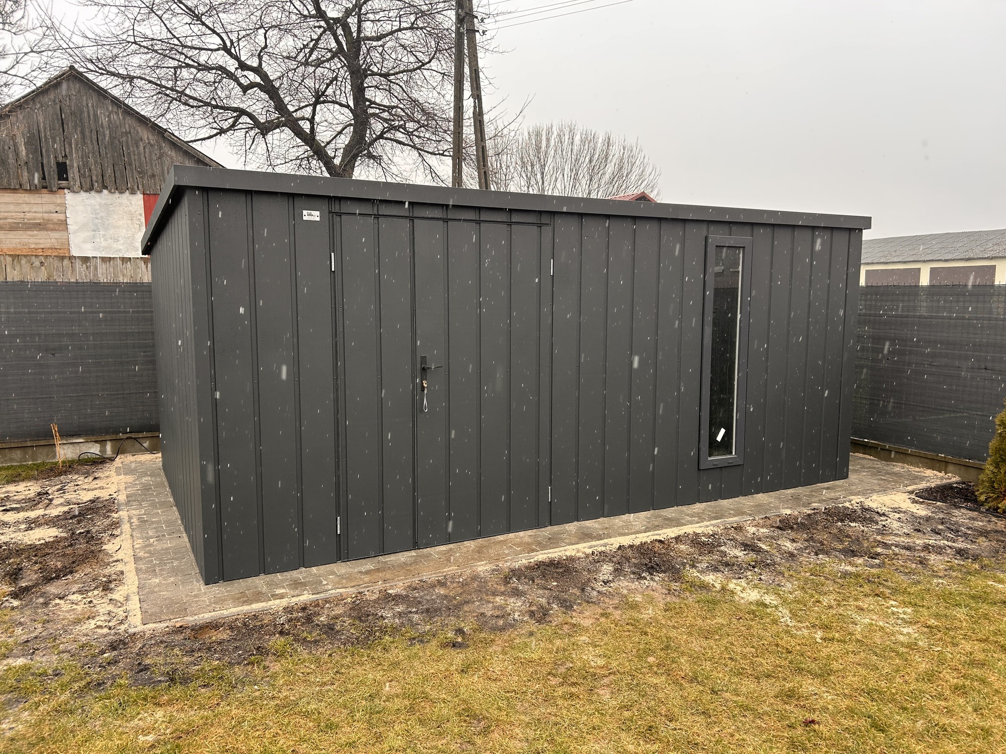 Dach jednospadowy na tył, blacha trapezowa z filcem antyskropleniowym, kolor grafit mat 7016