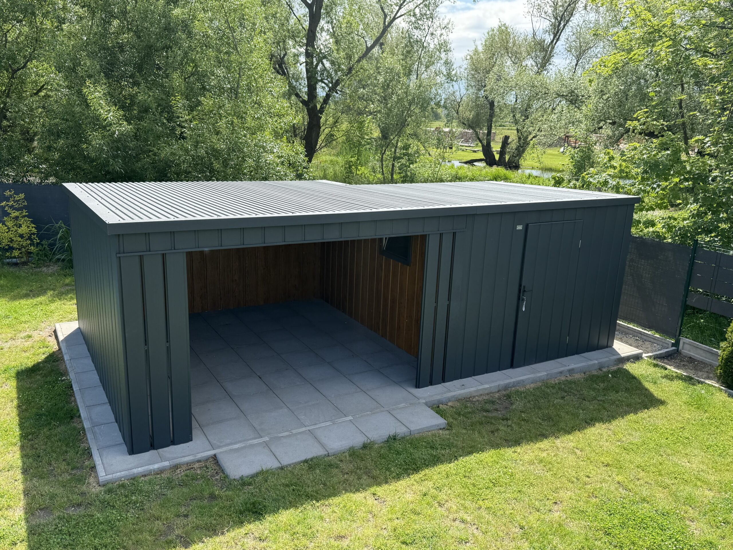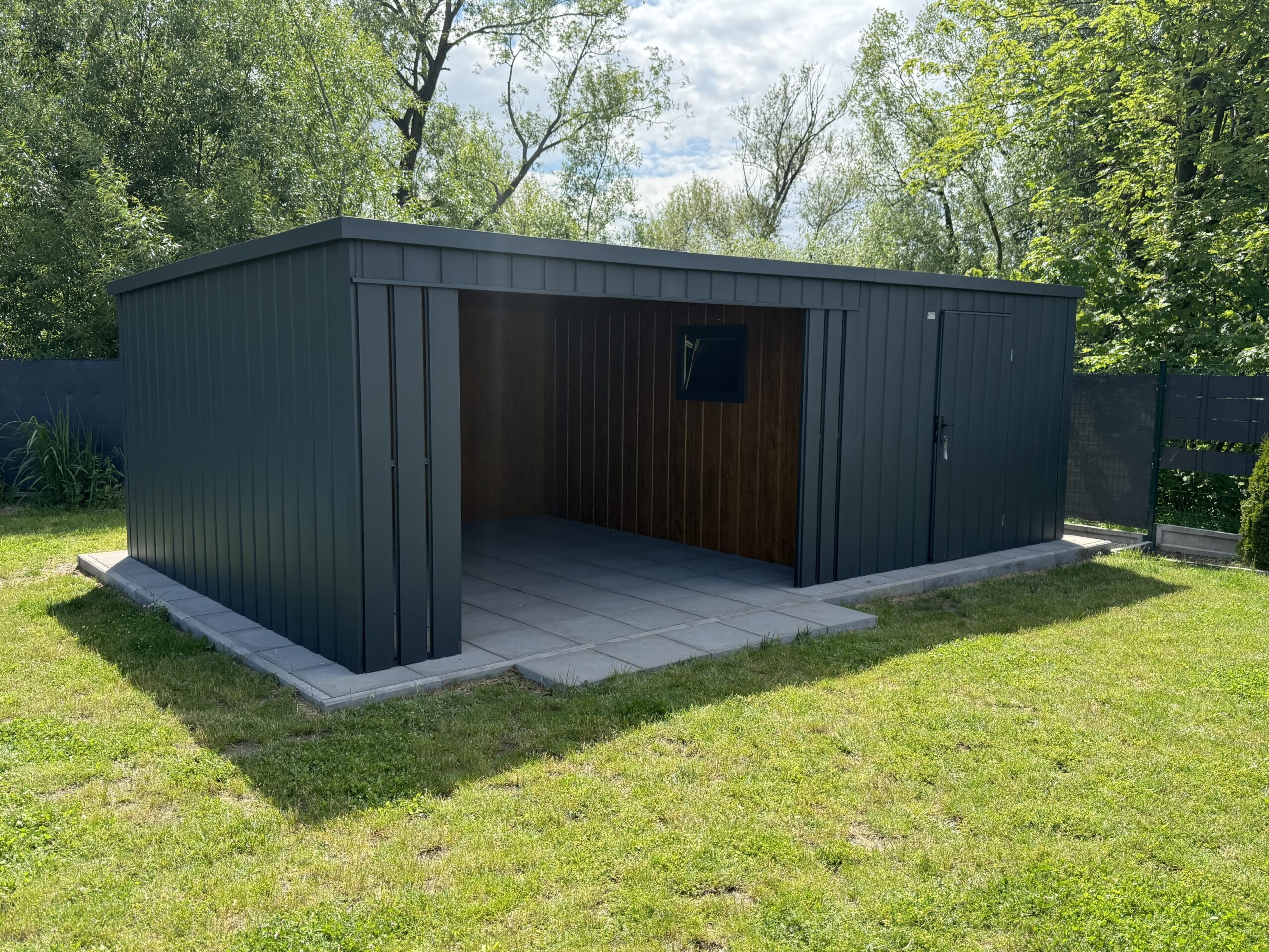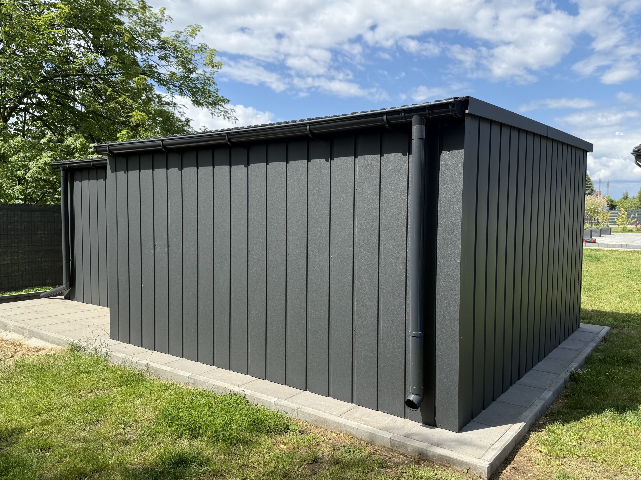 Dach jednospadowy na tył, blacha trapezowa t-14 z filcem antyskropleniowym, kolor grafit mat 7016